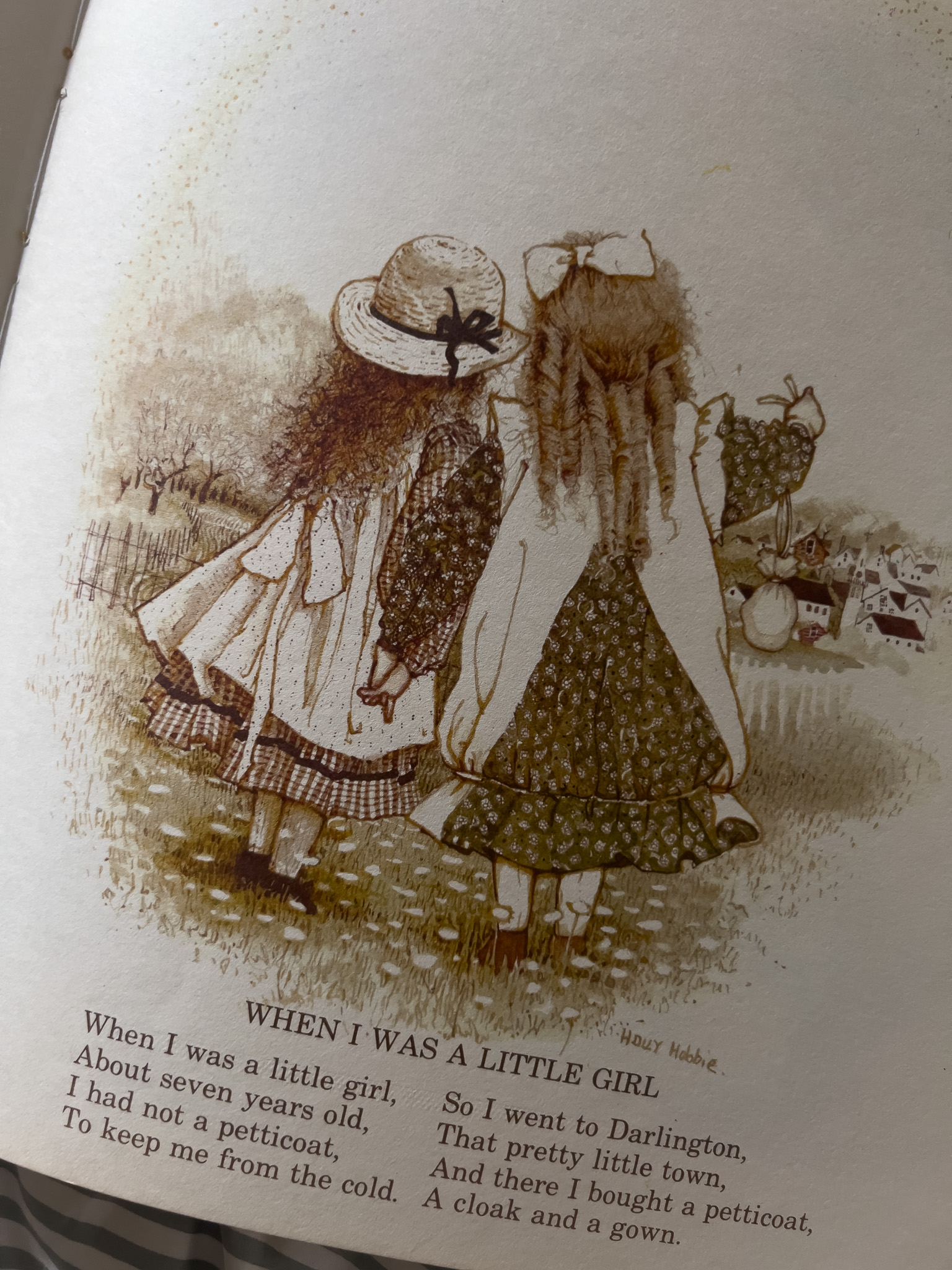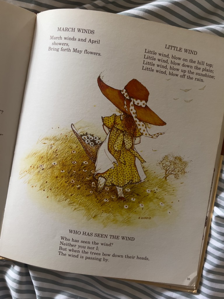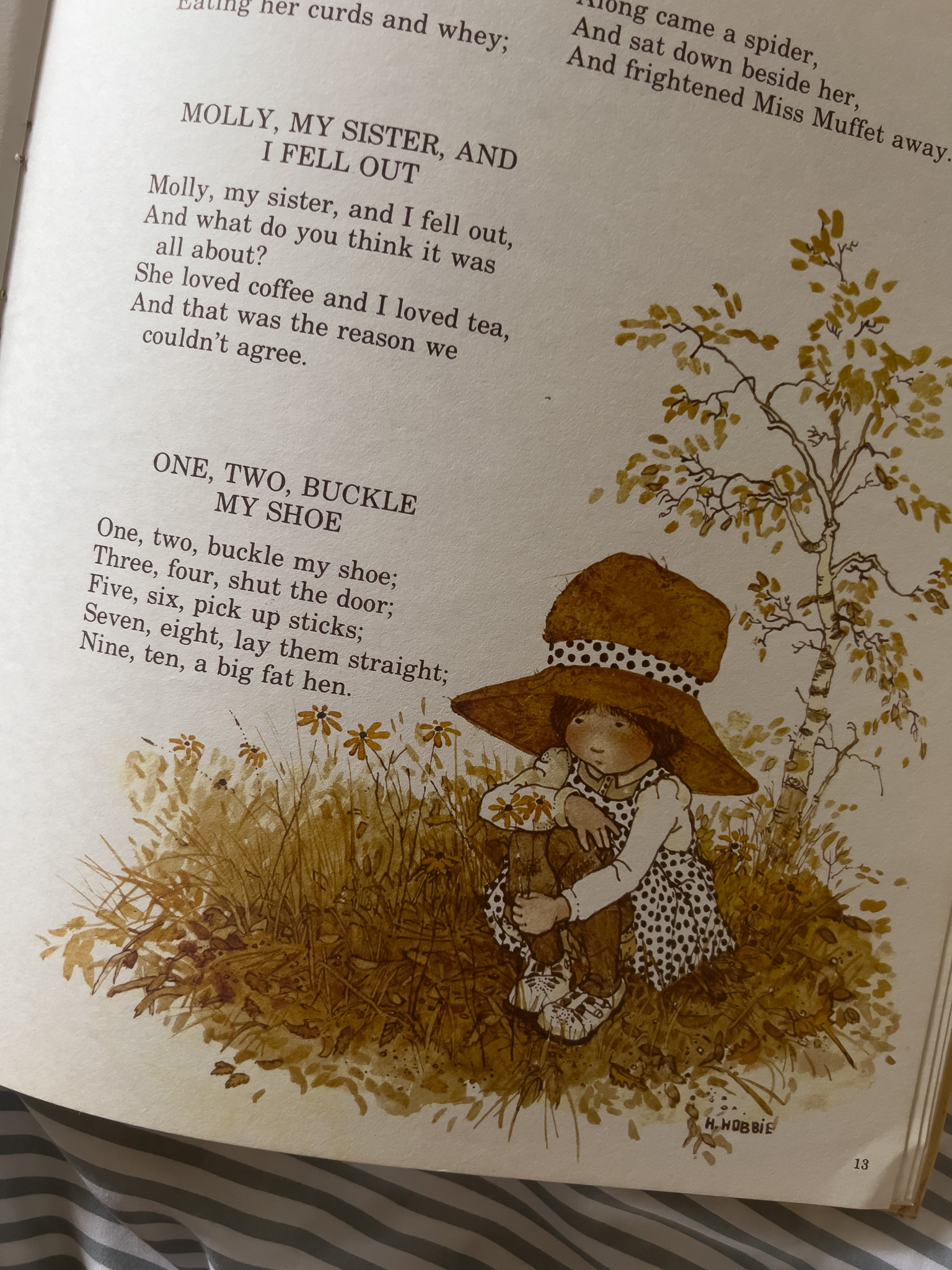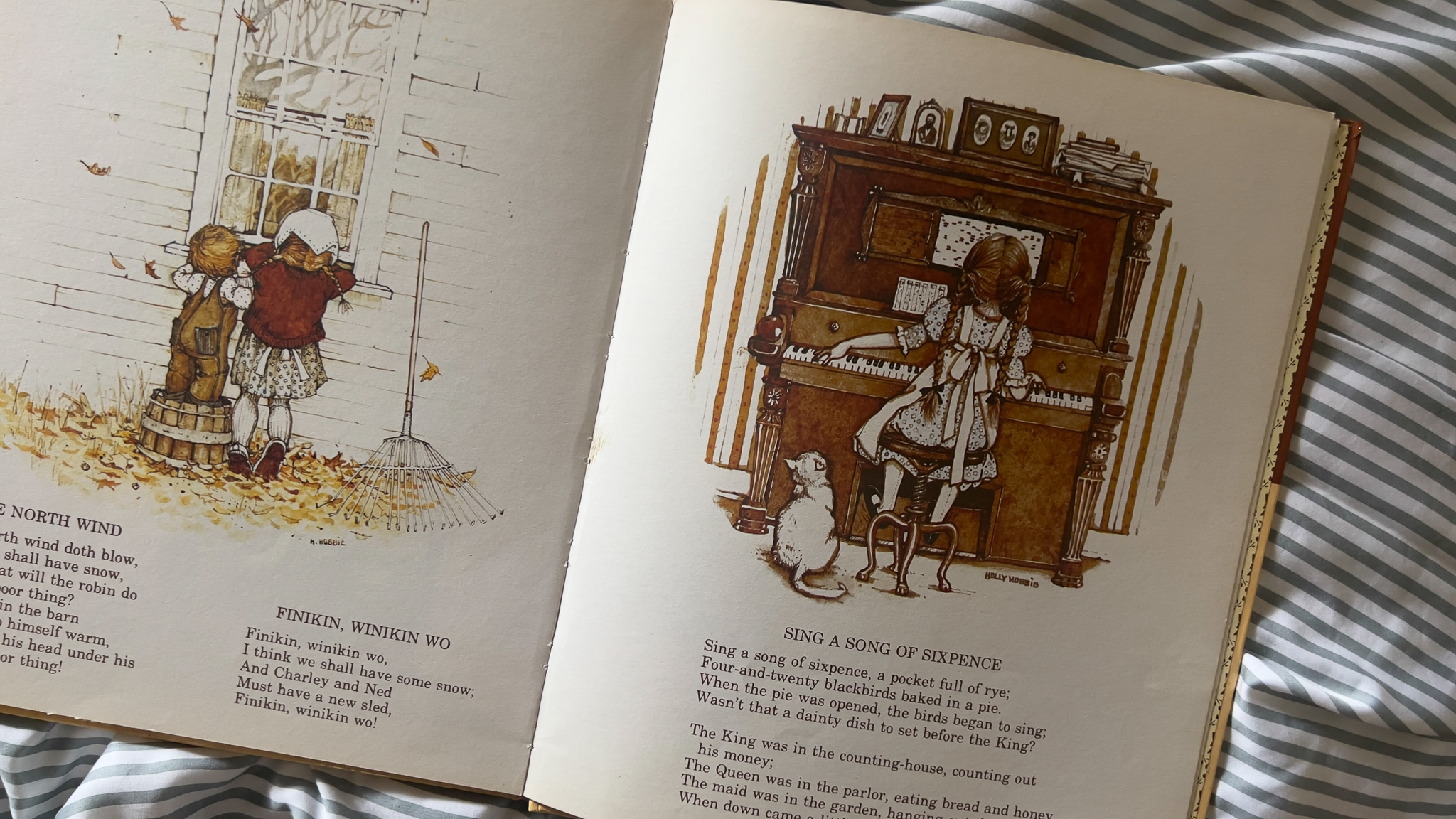 The words of the rhymes themselves were a bit of a mystery to me (Ring around the rosie / A pocketful of posies / Ashes, ashes / We all fall down), but I loved reading and looking at them all the same. Even now, anytime I hear or read a nursery rhyme, a specific page from that book flashes in my mind.